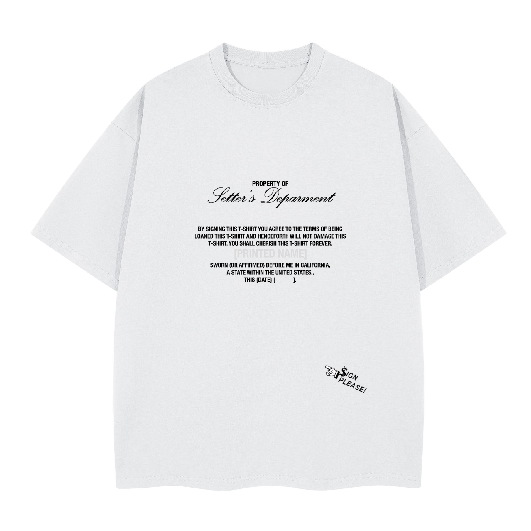 The T$ Loaner Tee isn’t just a shirt—it’s a contract. Inspired by notarized documents and the ritual of signing your name, this design plays with the idea of ownership, value, and the fine print we usually skip.